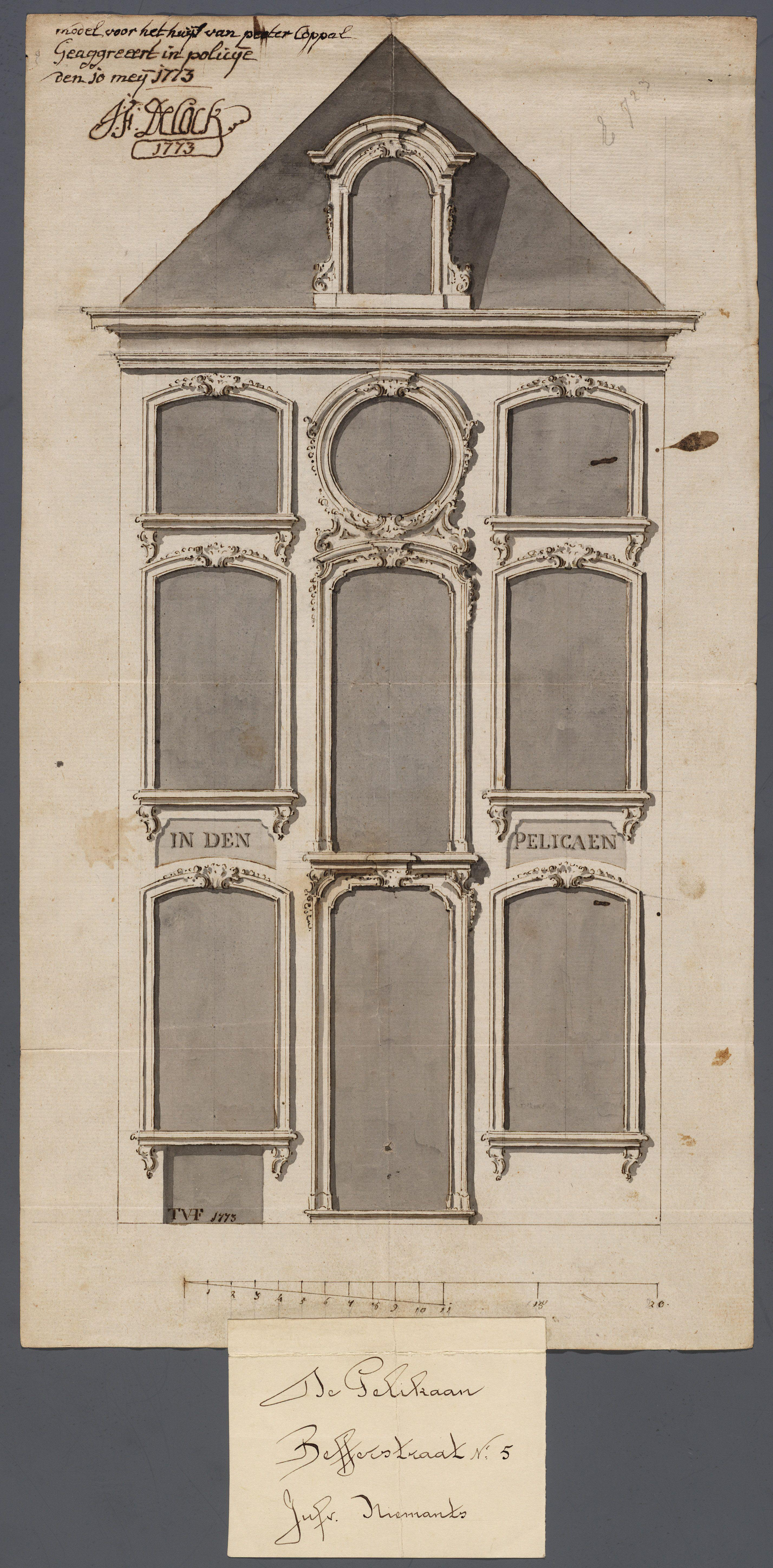 Hoewel de huidige gevel pas in 1773 werd vergund, zoals blijkt uit de bijgevoegde bouwtekening, reikt de geschiedenis van dit pand veel verder terug: het werd al vermeld in 1559. De naam verwijst naar de pelikaan, destijds een populaire symbolische vogel. Men geloofde dat hij zijn jongen voedde met eigen bloed, wat hem tot een Christus-symbool maakte. In het smeedwerk van het balkon op de eerste verdieping zijn nog altijd sporen van een pelikaansnest te herkennen.