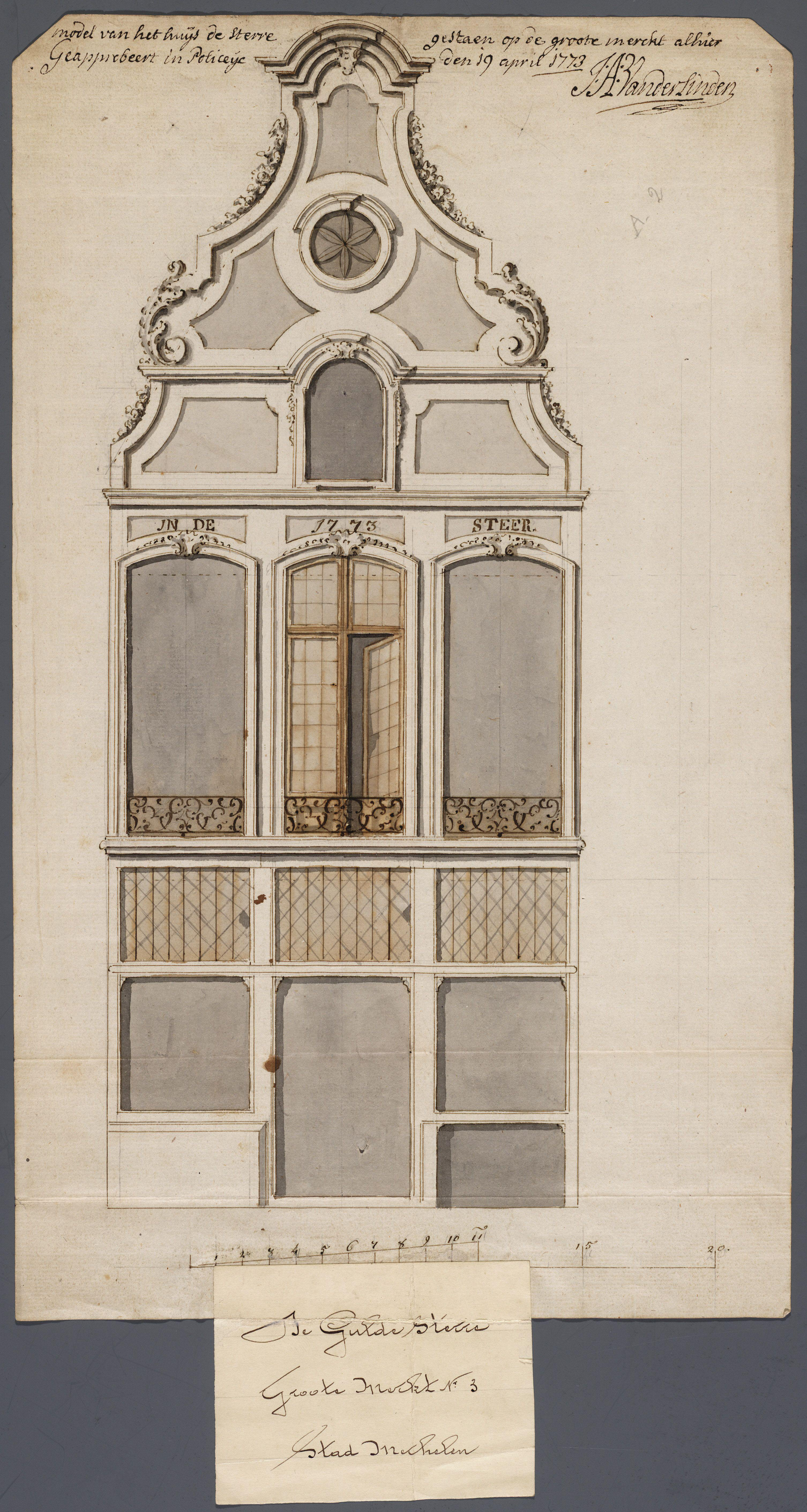 Tegelijk met het buurpand op Grote Markt 2 werd het huis ‘De Sterre’ van een stenen gevel voorzien. Het ontwerp bleef bewaard en het handteken symboliseert de administratieve goedkeuring. Eigenaar was Nicolas Walravens, procureur en notaris. De stad verleende hem, en ook de aan dit project werkende controleur Verhuyck en steenhouwer Van Buscom, vrijdom van accijns op “vier aemen goet [bier], ende aght aemen cleijn bier”. Een Mechelse aam was ongeveer 130 liter – we mogen aannemen dat de begunstigden een aantal jaren van deze vrijdom konden genieten!