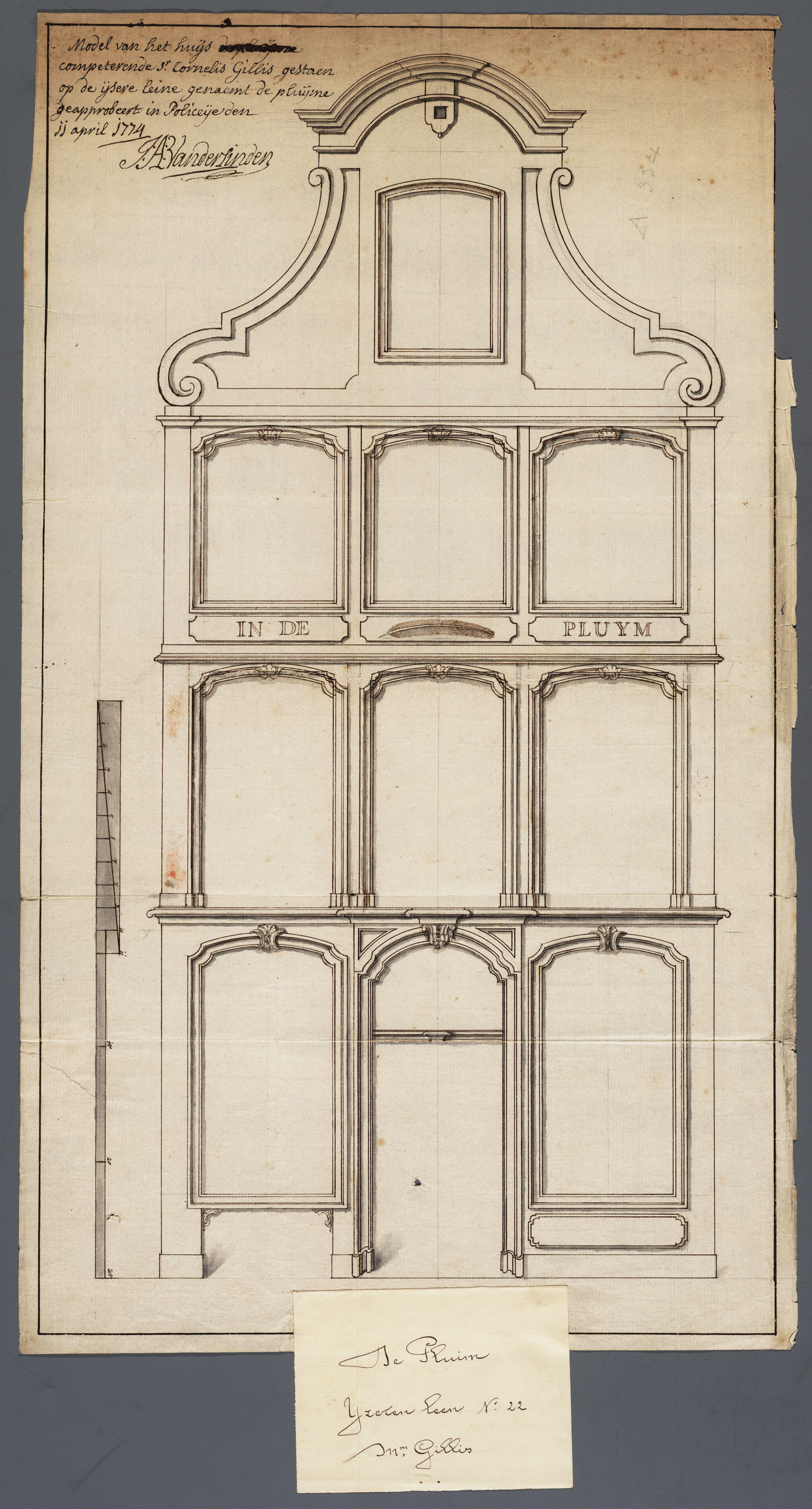 De gevel van ‘In den Pluym’, geplaatst in 1774, is ontworpen volgens de bijgevoegde tekening. Zoom eens goed in: onder de ramen van de tweede verdieping prijkt trots de naam van het huis – én een gebeeldhouwde veer.