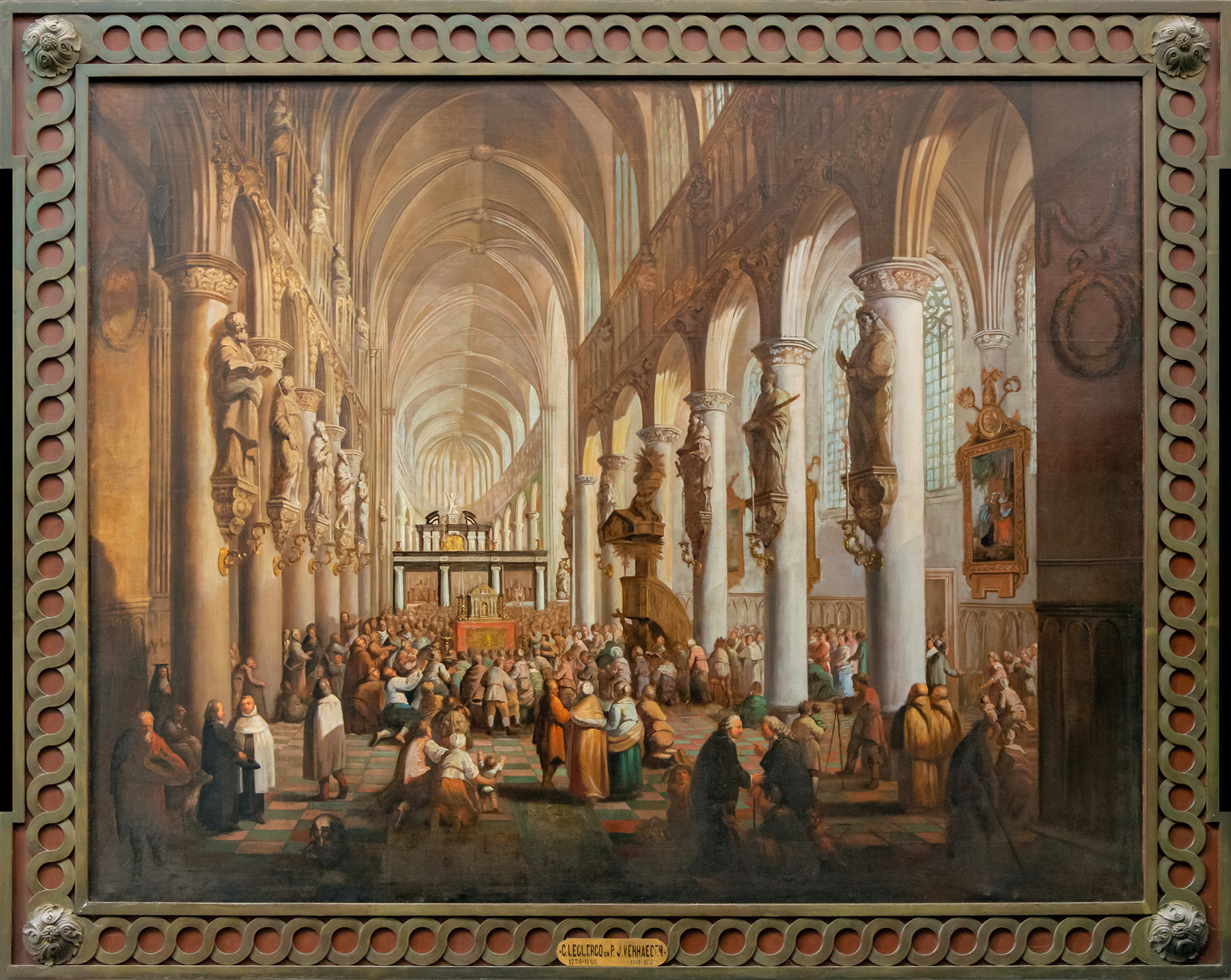We beginnen onze tocht met een bijzondere blikvanger: het schilderij Interieur van de kathedraal tijdens de jubelfeesten van 1775, gemaakt door Pieter Verhaghen en Charles Le Clercq. Je ziet er het schrijn van Sint-Rombout, omringd door gelovigen: een levendig beeld van hoe het er toen aan toe ging.