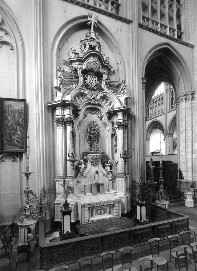 De foto van rond 1942, afkomstig uit het archief van het KIK, toont het altaar nog op zijn vroegere plek in de noordelijke dwarsbeuk. Tijdens de grote interieurrestauratie in de jaren 1960 werd het 18de-eeuwse pronkstuk verplaatst naar zijn huidige, prominente locatie.